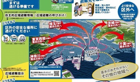 余談だが市川市と江戸川を挟んだ反対側が東京都の江戸川区。人気のエリアだ。なぜ人気かというと「マンションがいちばん安い東京都」。東京都民になりたいという見栄をリーズナブルな価格で満たすことができる。買い物や娯楽施設は市川や浦安のがあるのにな。あとネットで見た画像で、てっきりネタかと思って江戸川区のホームページを見たら事実だったよ。江戸川区の防災マップ。江戸川区は荒川と江戸川に挟まれているが河川が氾濫したときの避難のしかたが図示されている。