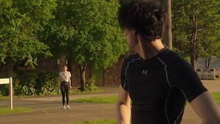 困惑する不動に対して、やっと不動と二人きりになって話を聞いてもらえると喜ぶハナ。ところで泉里香が来ているシャツ。これは胸がまったく目立たないし走っても揺れないんだよね。女性のファッションのことはまったくわからない私だが、これはそういうシャツなのか、下に付けているスポーツブラが優秀なの? 残念に思っている人は多いかもしれないがドラマに集中できないからね。